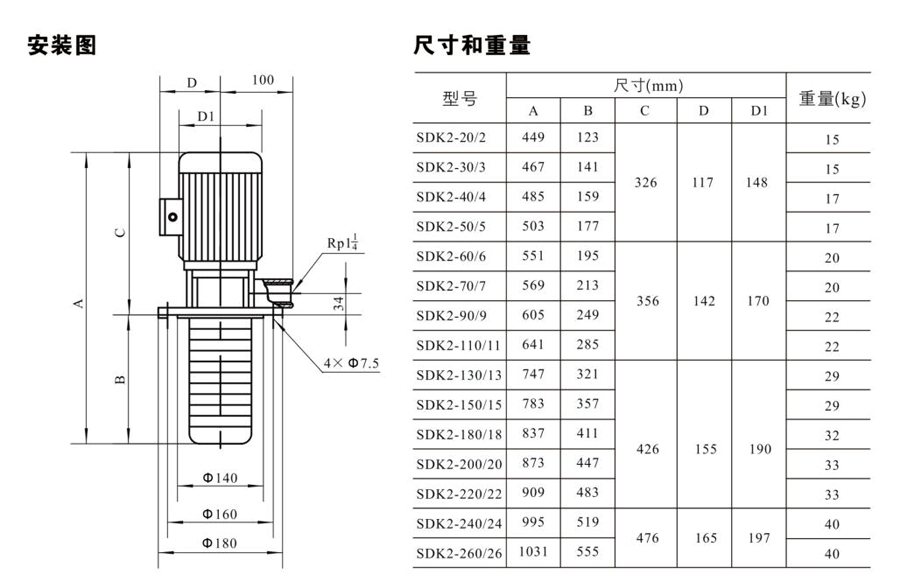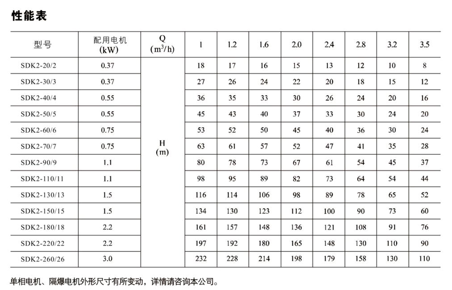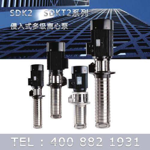SDK2/SDKT2為配用標準電機的非自吸立式多級離心泵,電機軸和泵軸用聯軸器直接聯接的結構。為滿足水槽或容器的安裝深度,可安裝空套的腔體來改變泵本身的侵入深度。
